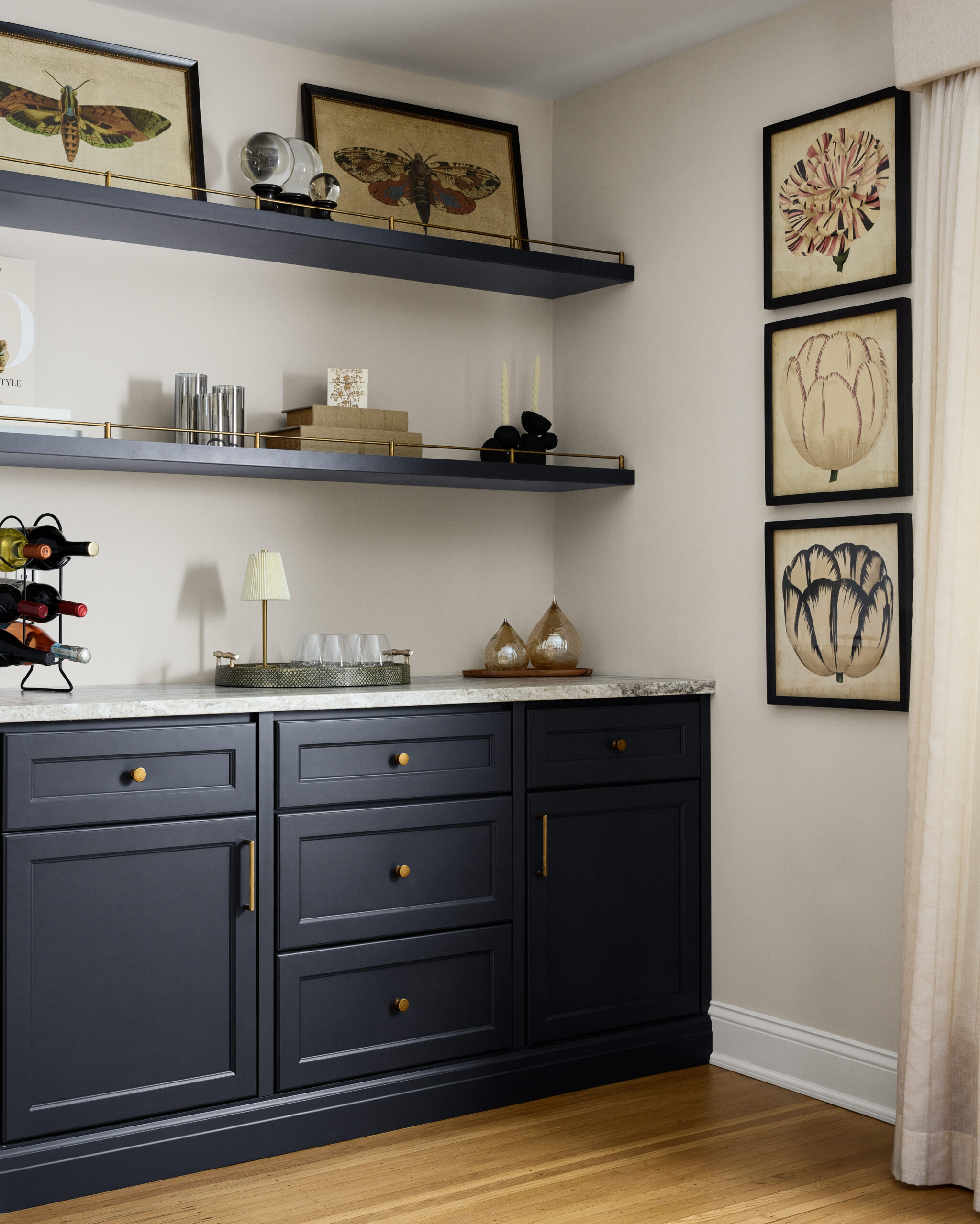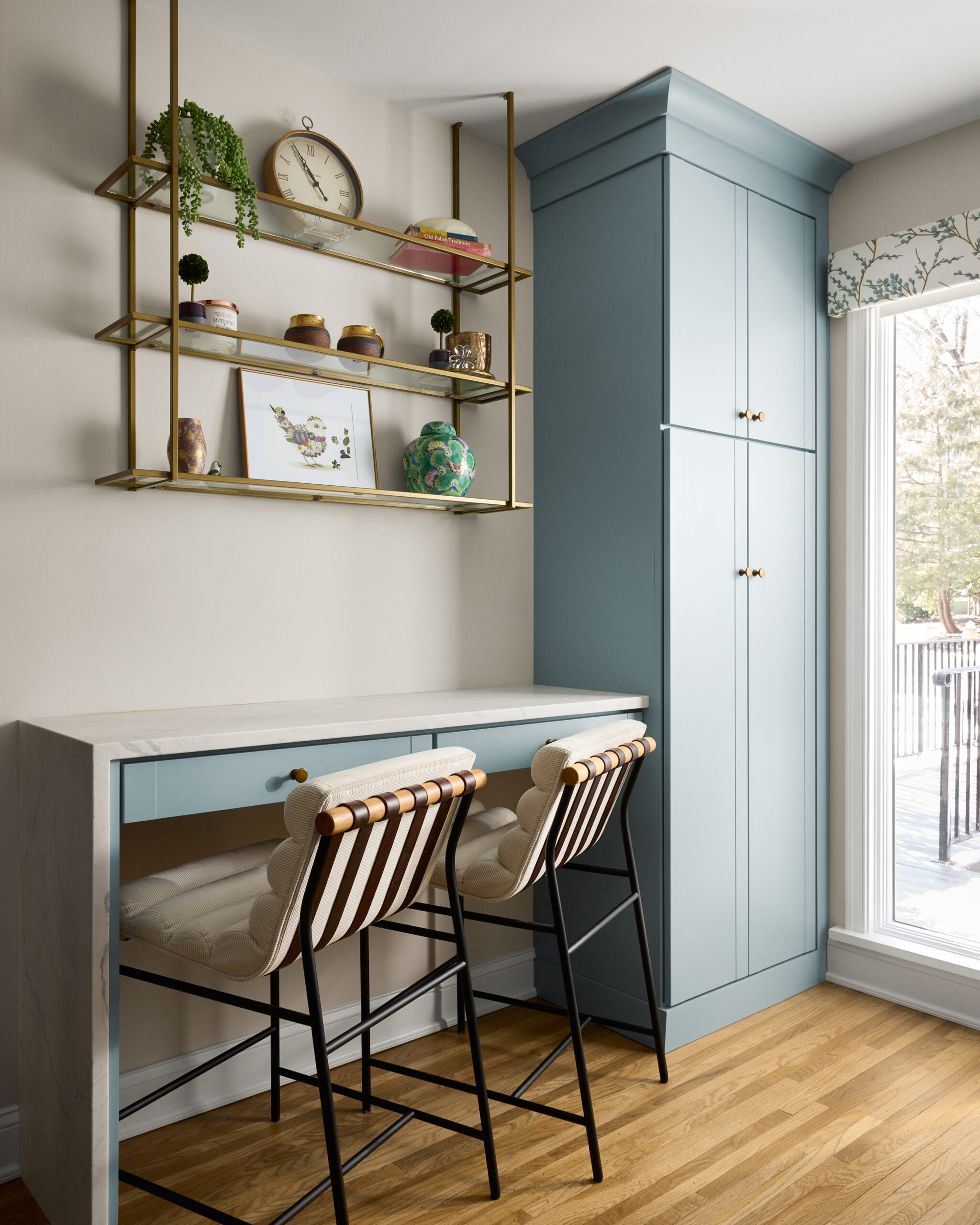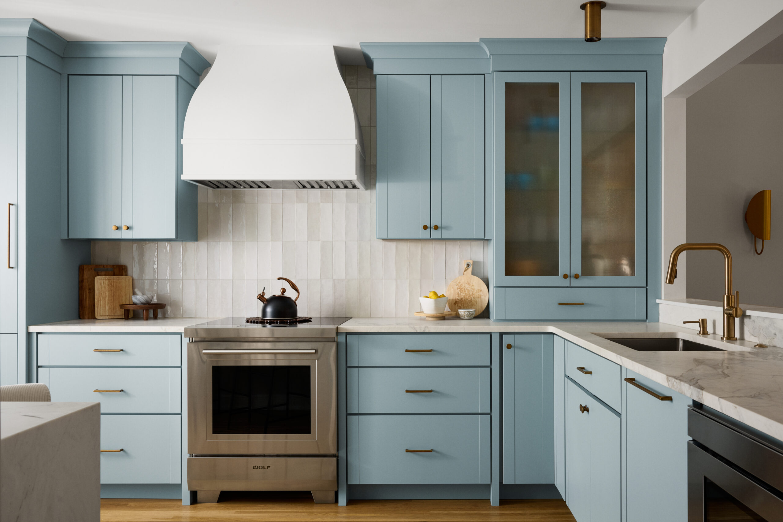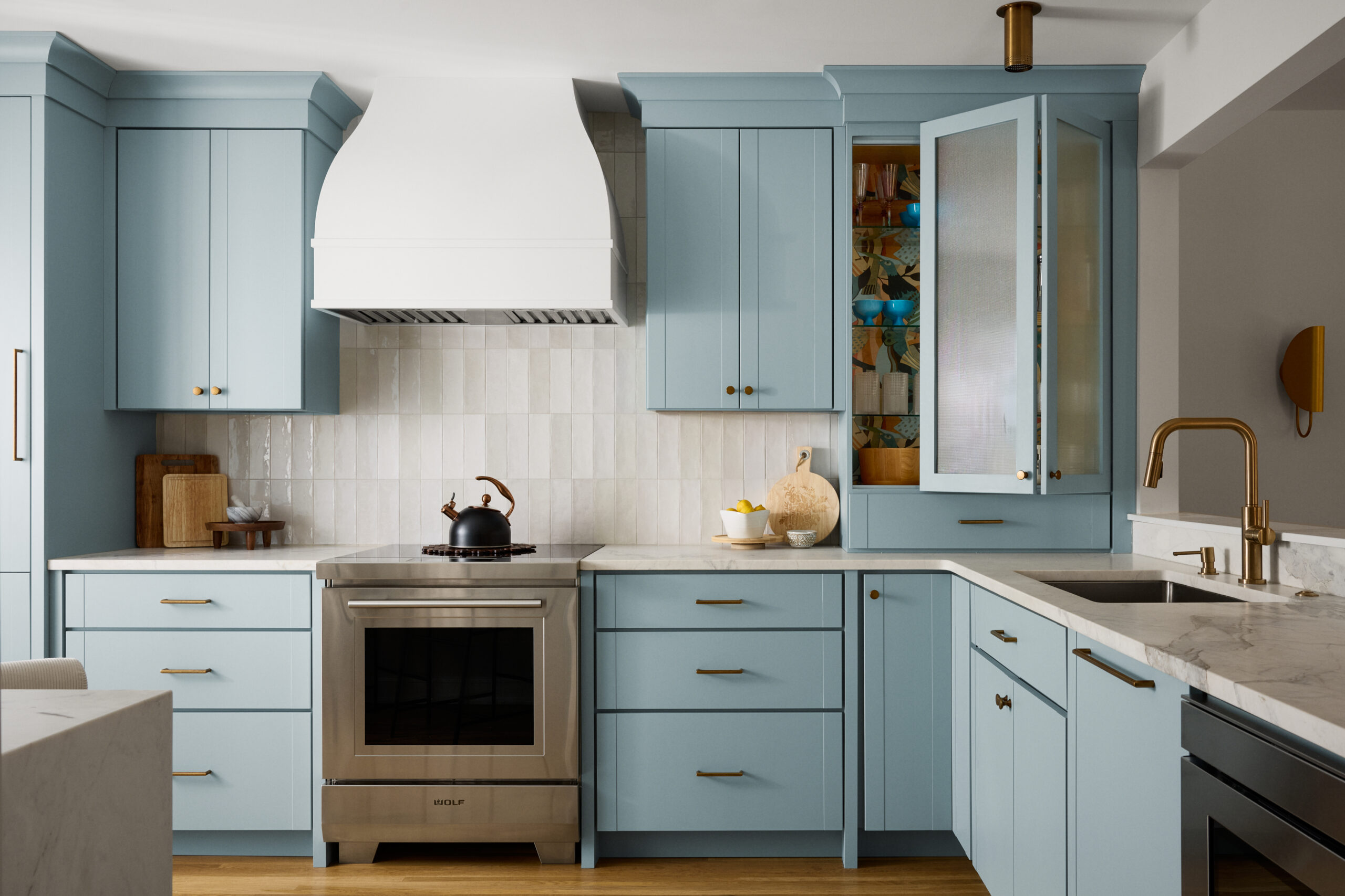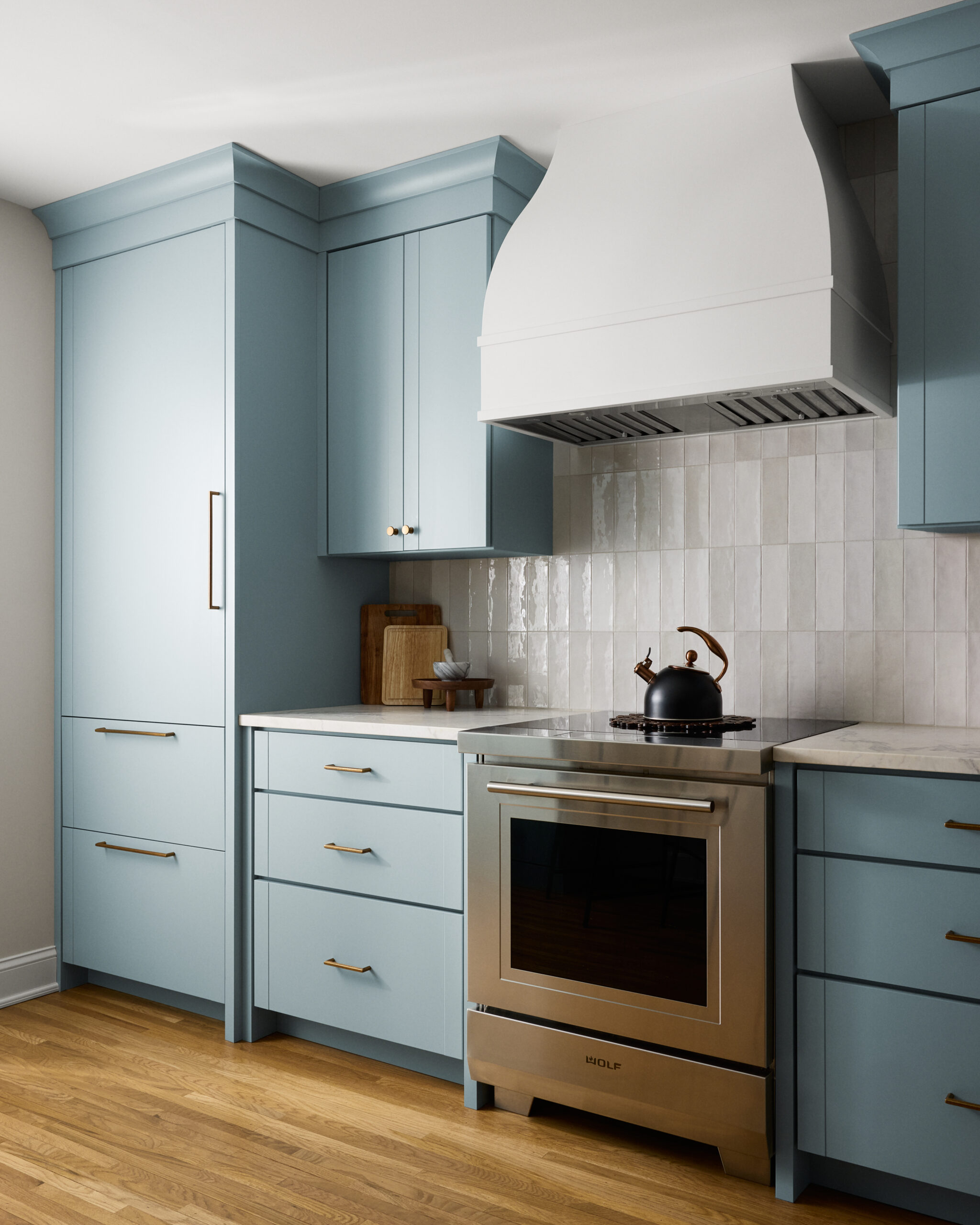 Custom cabinetry in Marina Blue establishes a strong focal point while remaining sophisticated. Quartite countertops were selected for their balanced movement and soft finish. Panel-ready Sub-Zero refrigeration and freezer drawers, along with a panel-ready dishwasher and built-in range, maintain clean lines throughout. A tulip-shaped range hood, color matched to the wall, introduces contrast against the cabinetry. Antique brass knobs and pulls were selected to complement the cabinetry and tie into the brass accents used throughout the kitchen.