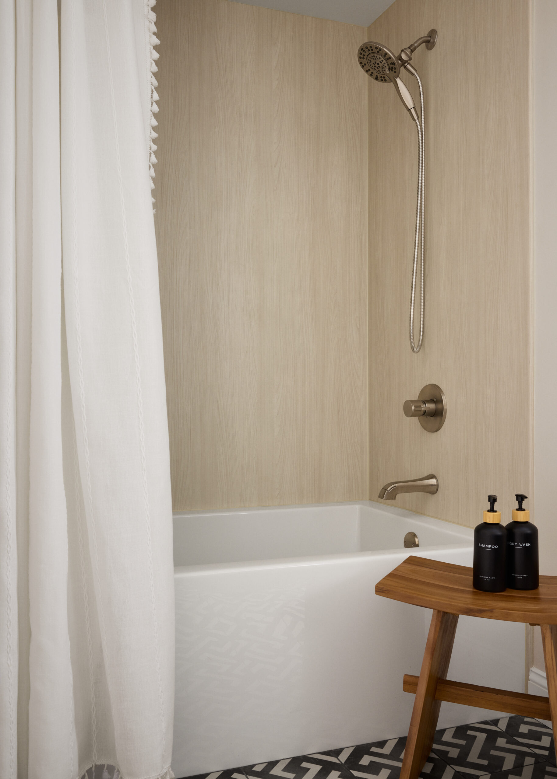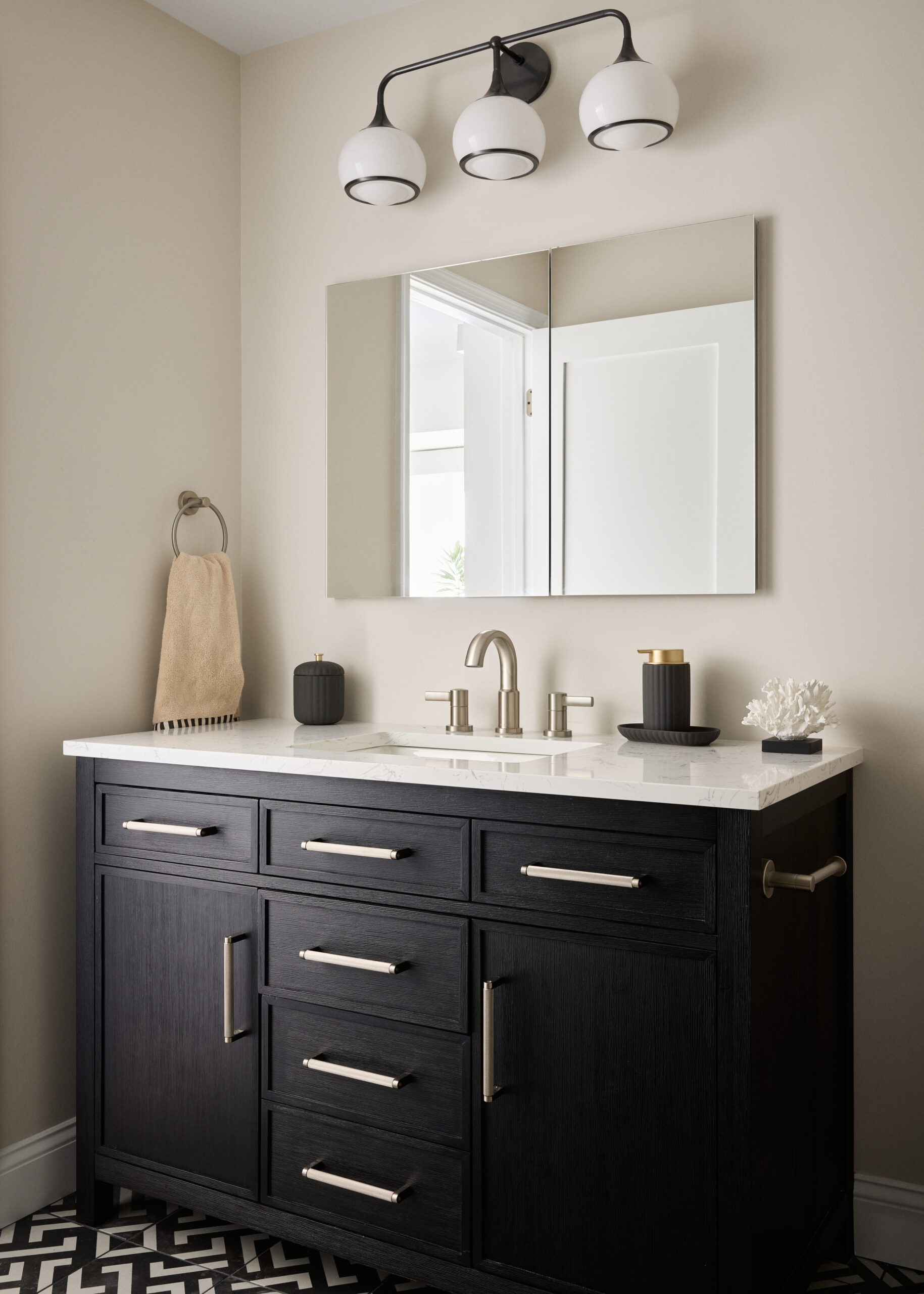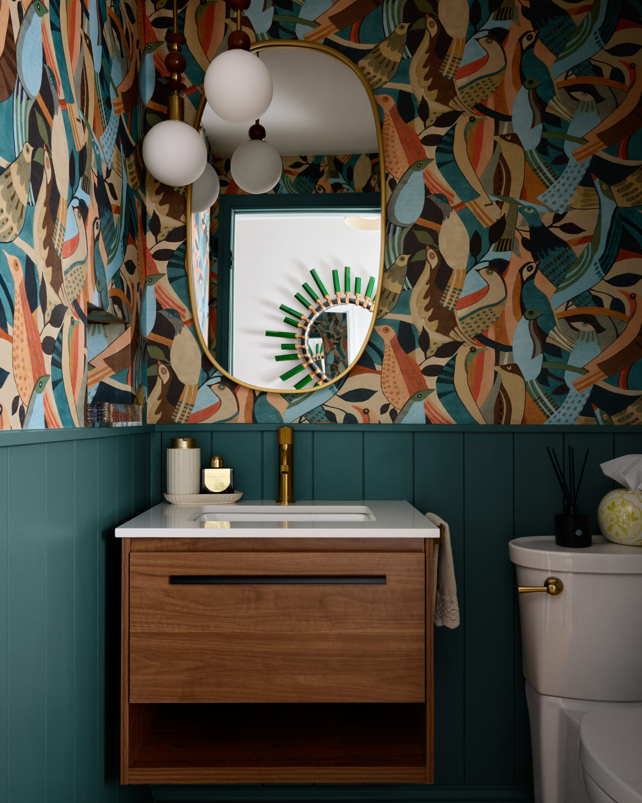The powder room retained its footprint but received a full finish update. Green wainscoting adds depth, while York Fauvist Flock wallpaper introduces pattern and personality.