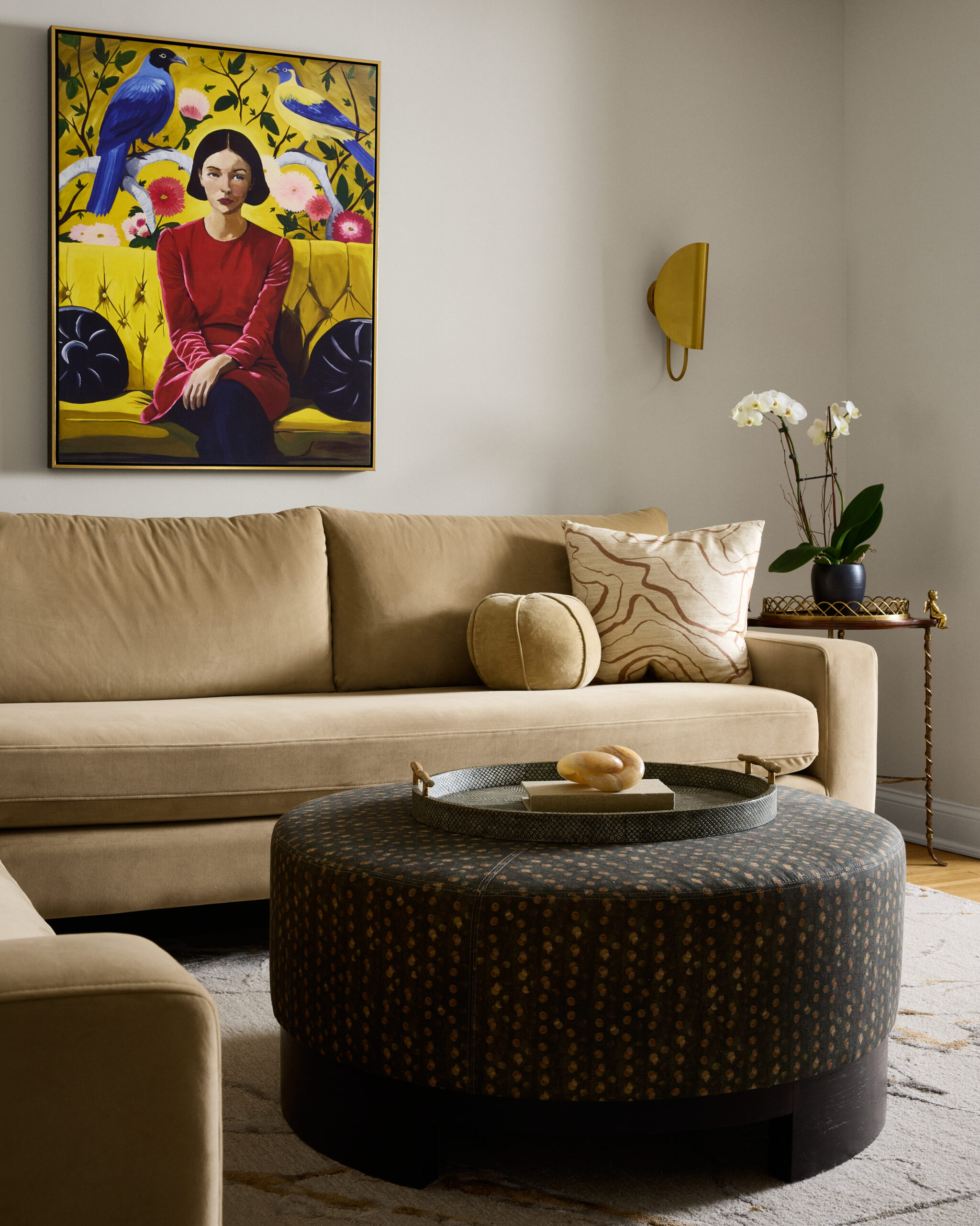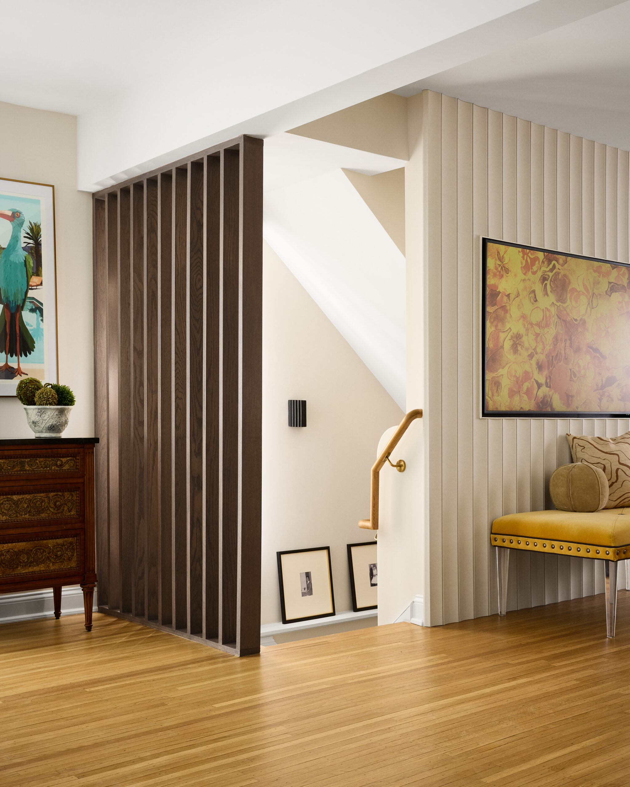 The stairwell was updated with a sculptural, graspable handrail accented by brass hardware and rounded contours. Modern LED wall sconces provide both safety and ambient lighting.