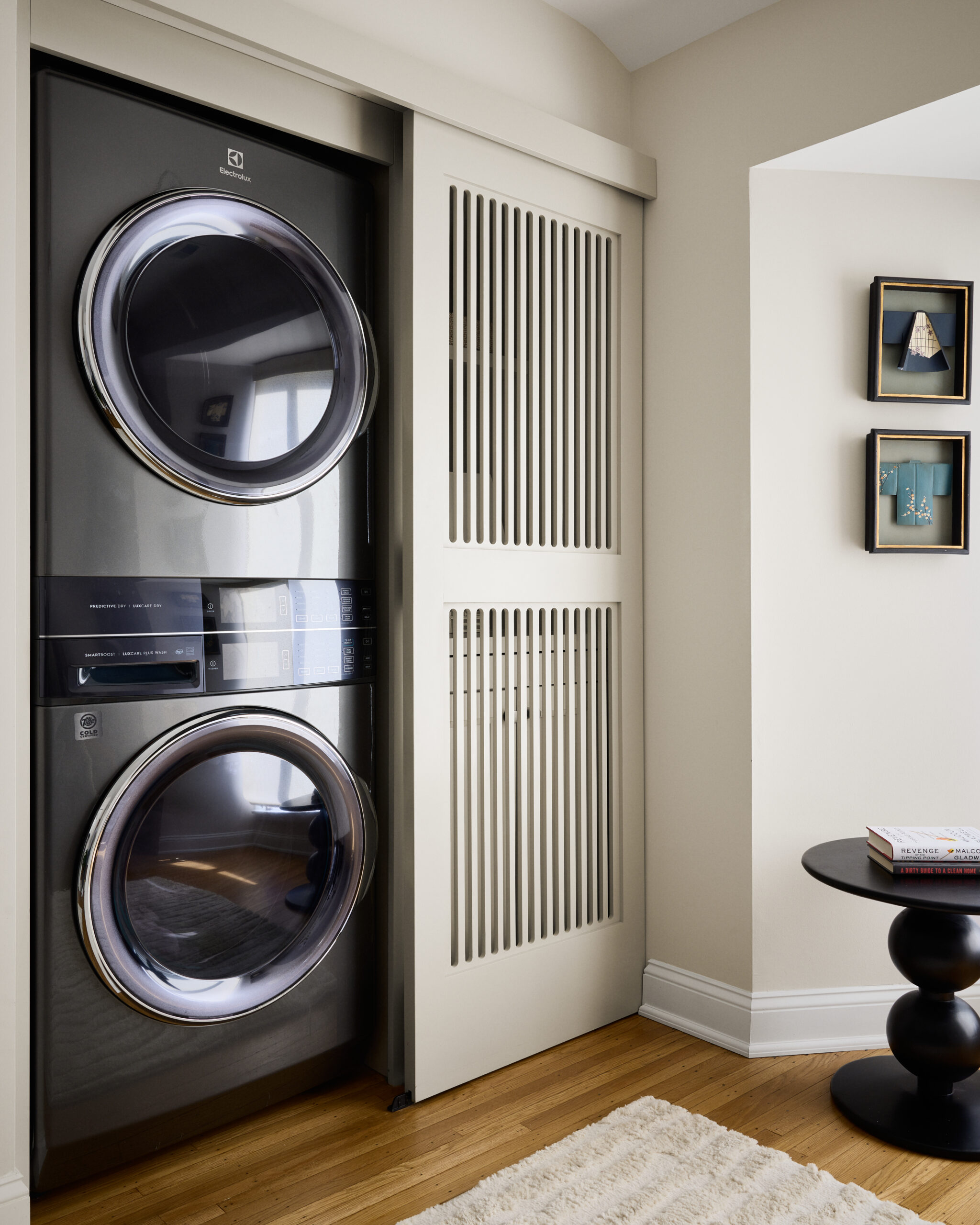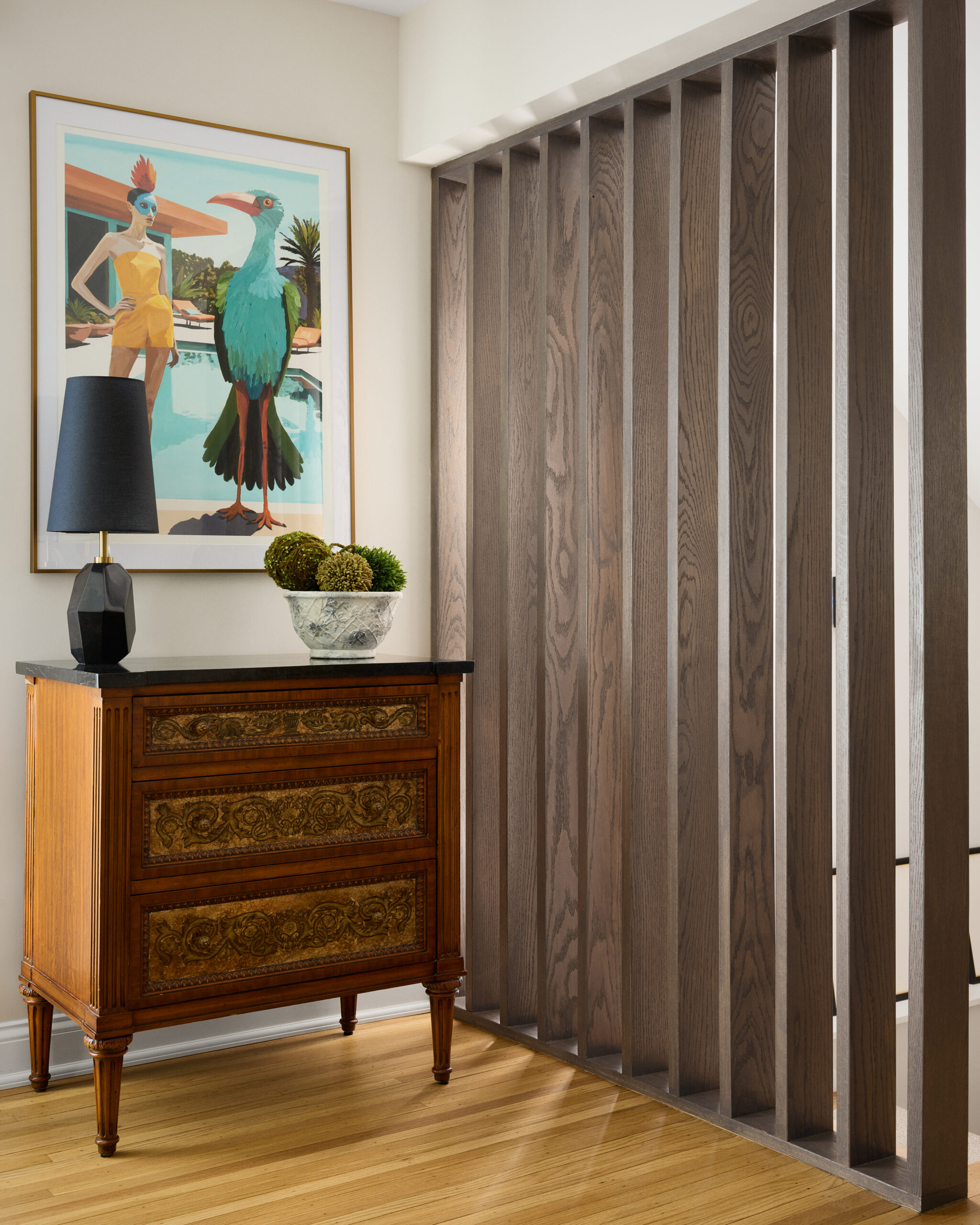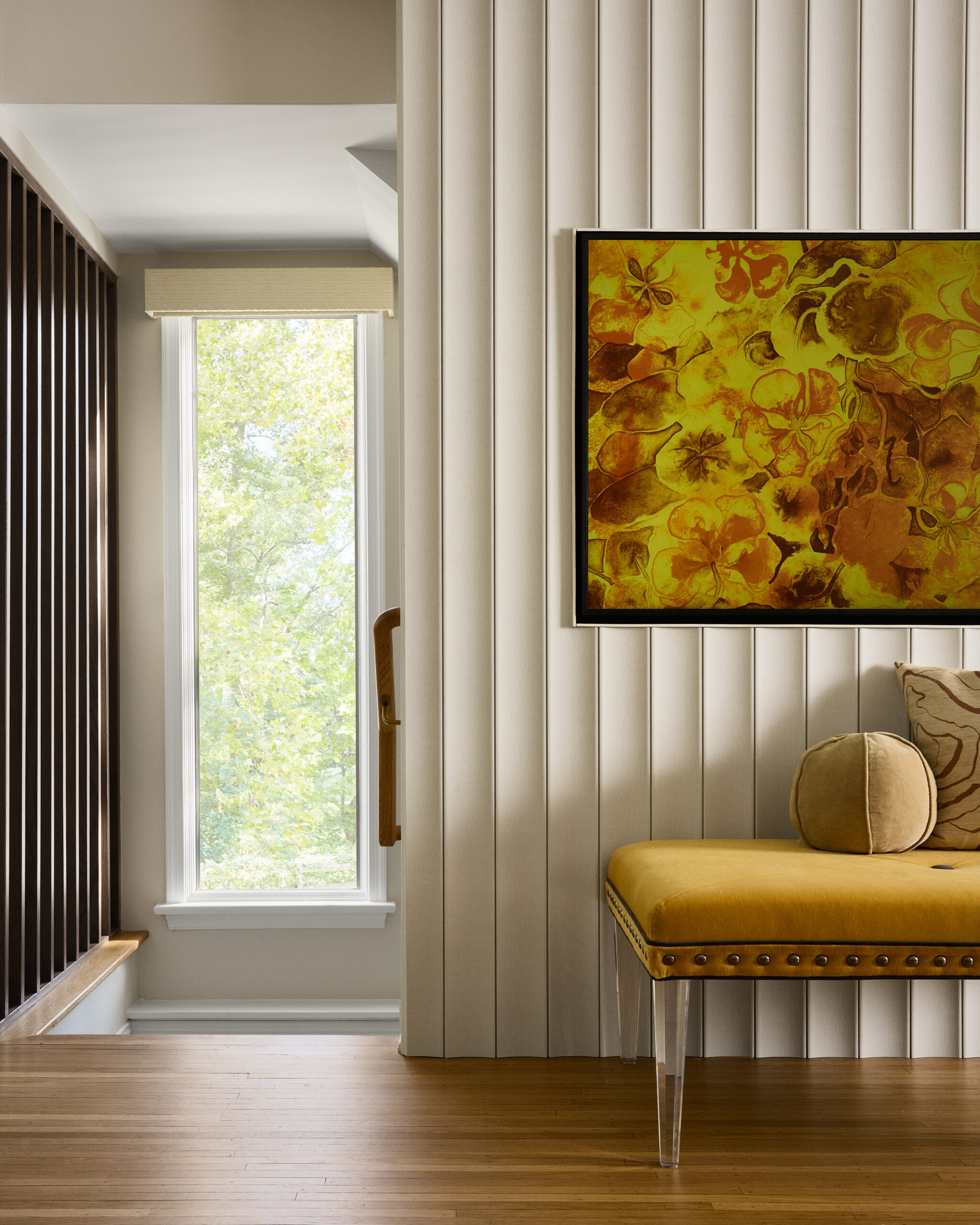 White oak flooring was installed across the kitchen, powder room, and foyer, with new boards carefully matched and woven into the existing hardwood before the entire floor was refinished for a seamless transition throughout. New trim and molding was added throughout the home, and all interior doors on the second floor were replaced to create a more unified architectural feel.