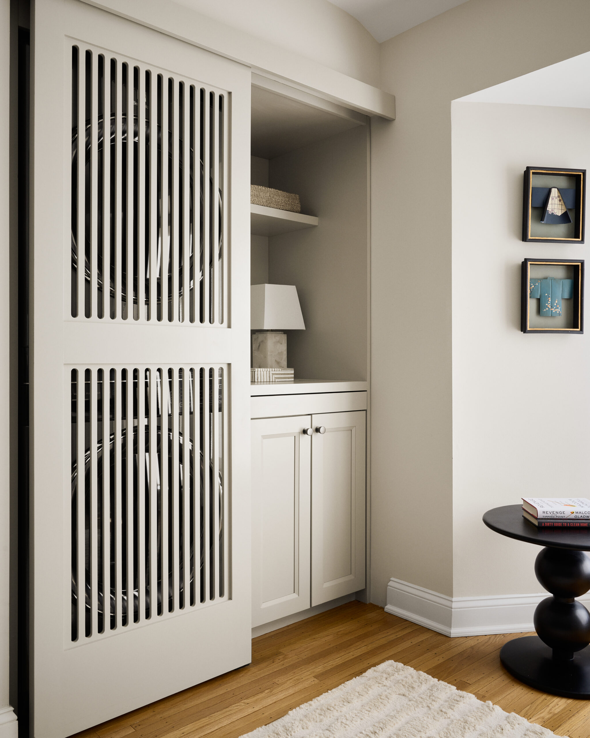 In the primary suite, a new wall and pocket door were added to create a secondary closet within a previously oversized bedroom. Accent wallpaper and hanging Capital Lighting Cecilia pendants behind the bed bring warmth and dimension to the space.