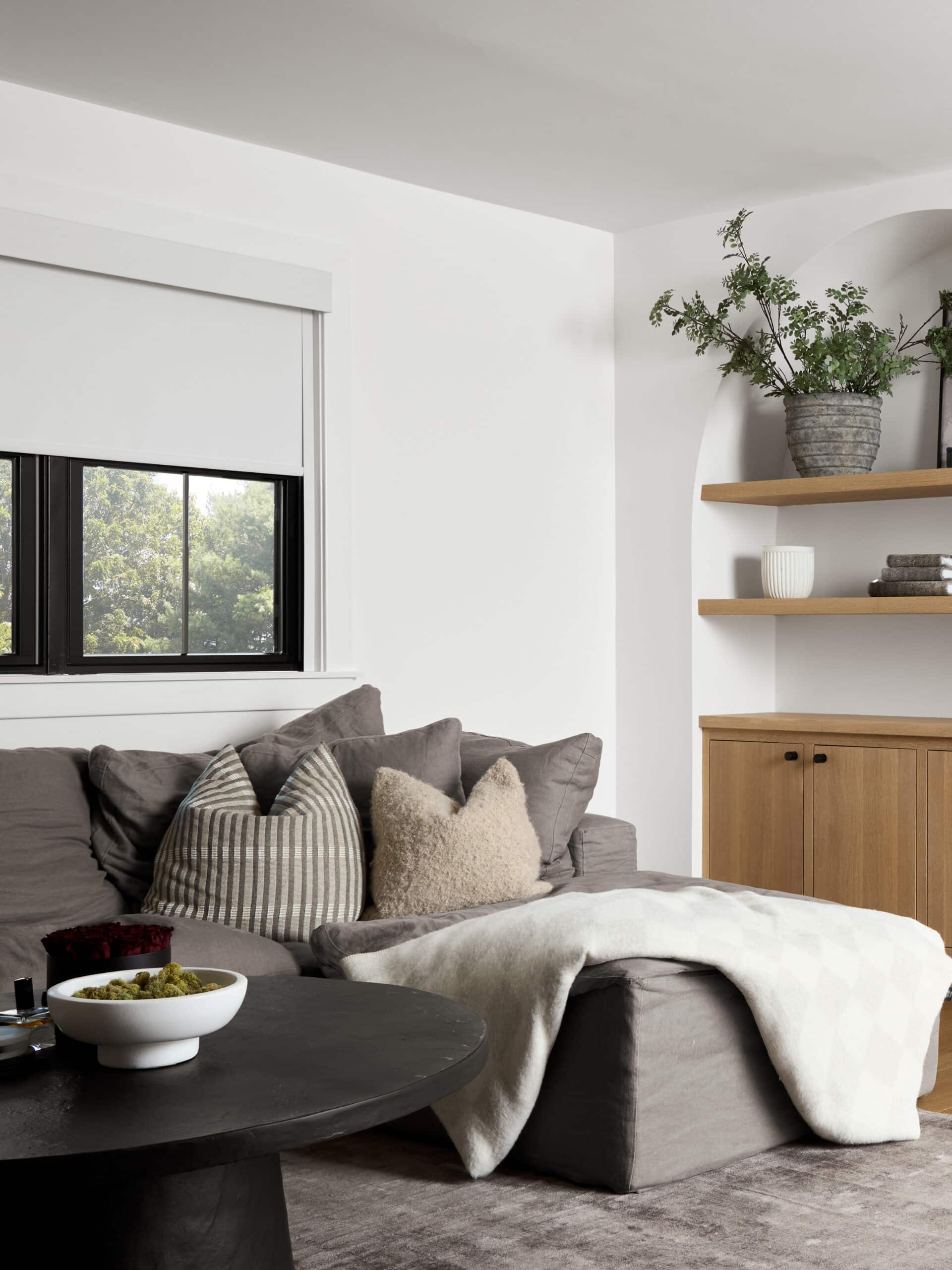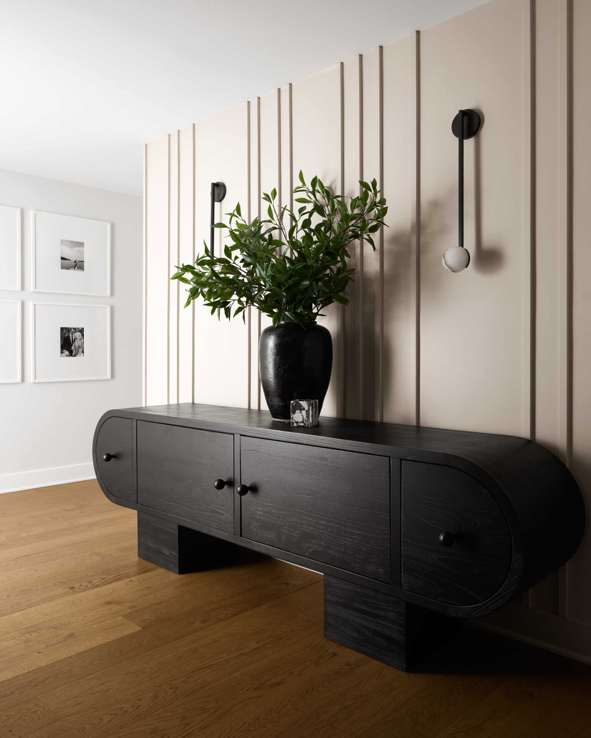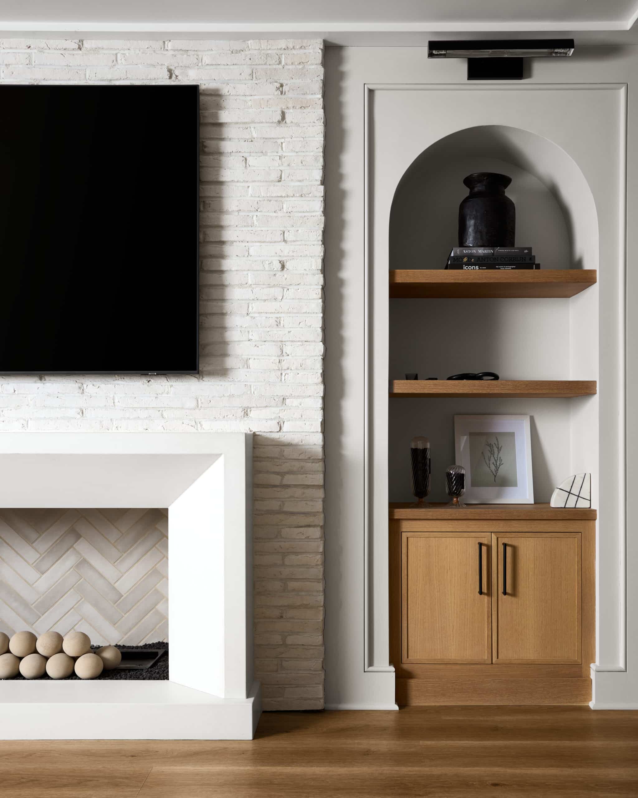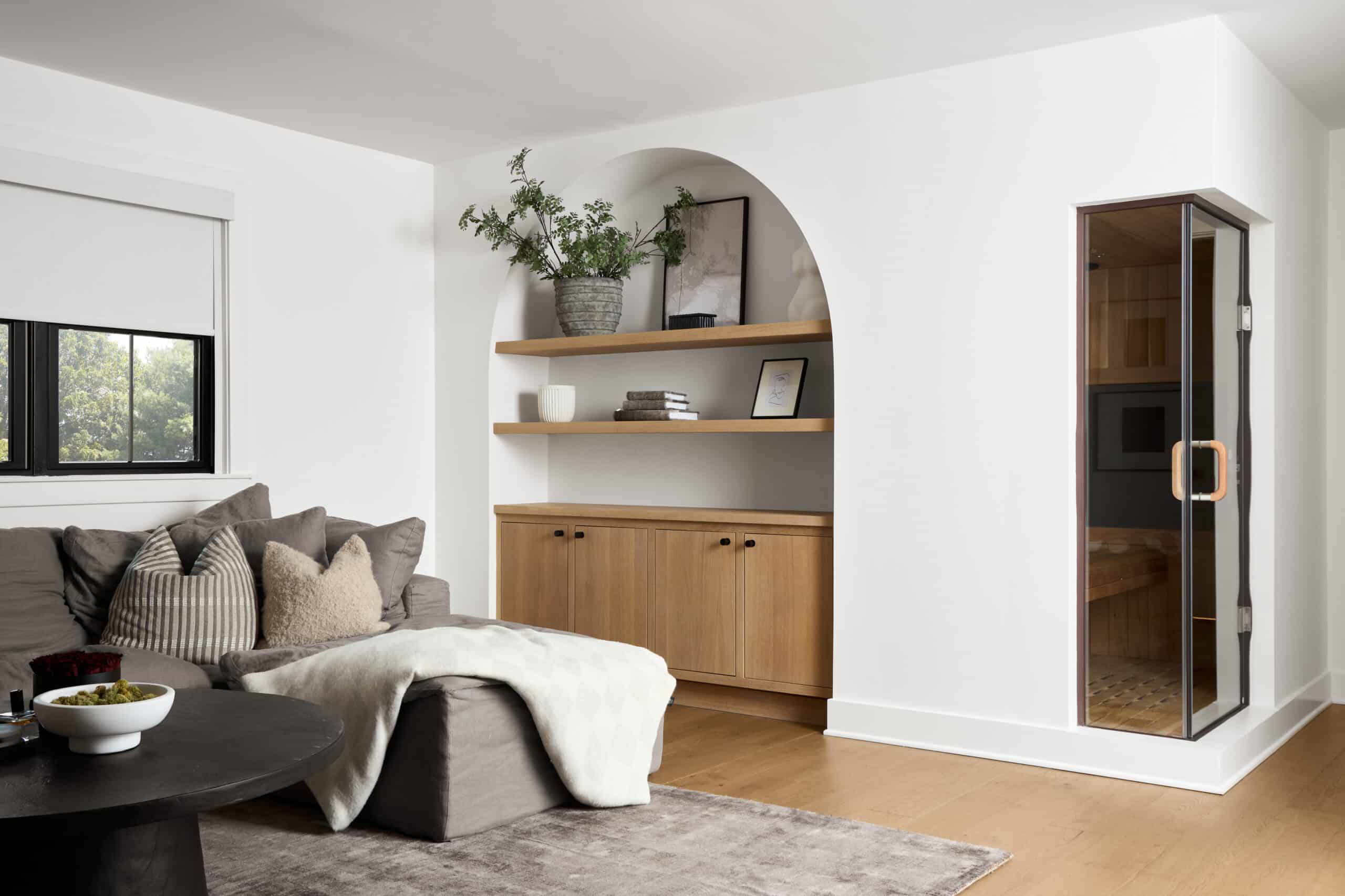 - Plaster-finished walls + tambour wood accents