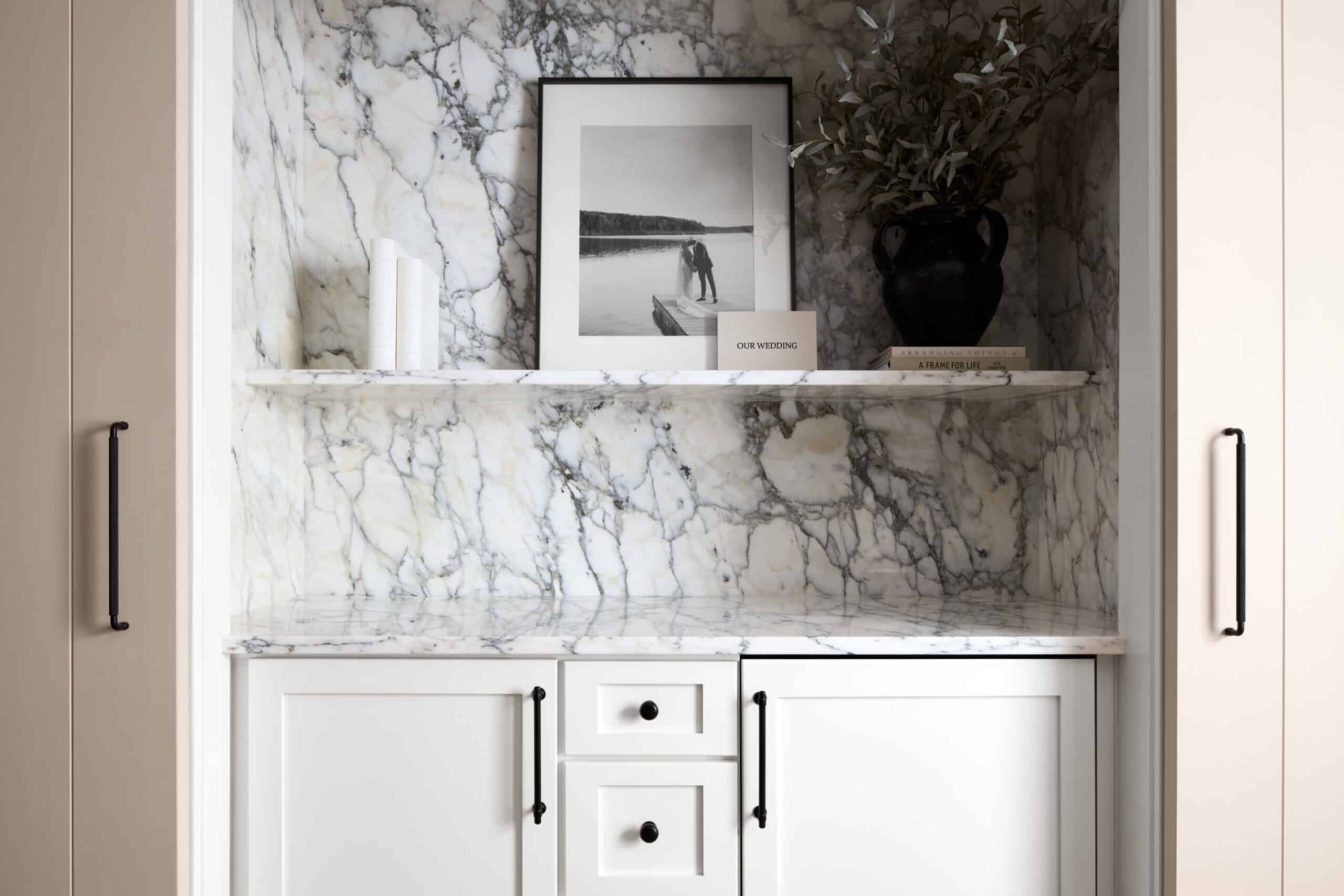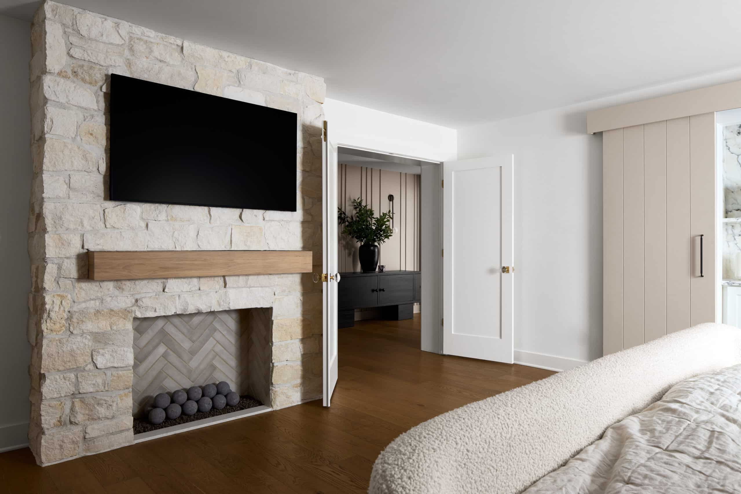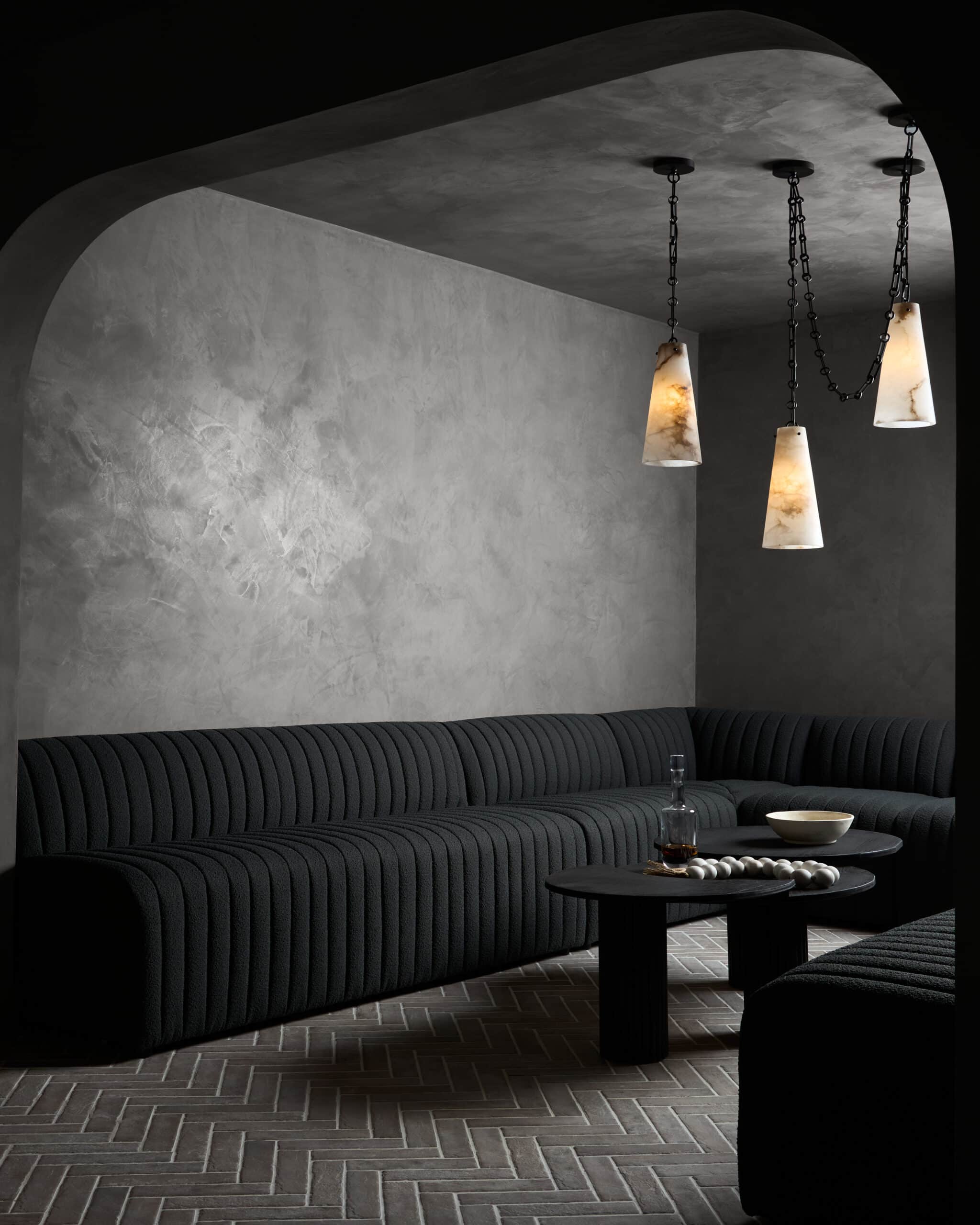 - Walls finished in hand-applied plaster and flanked by sleek tambour wood accents, adding warmth, depth, and tactile beauty